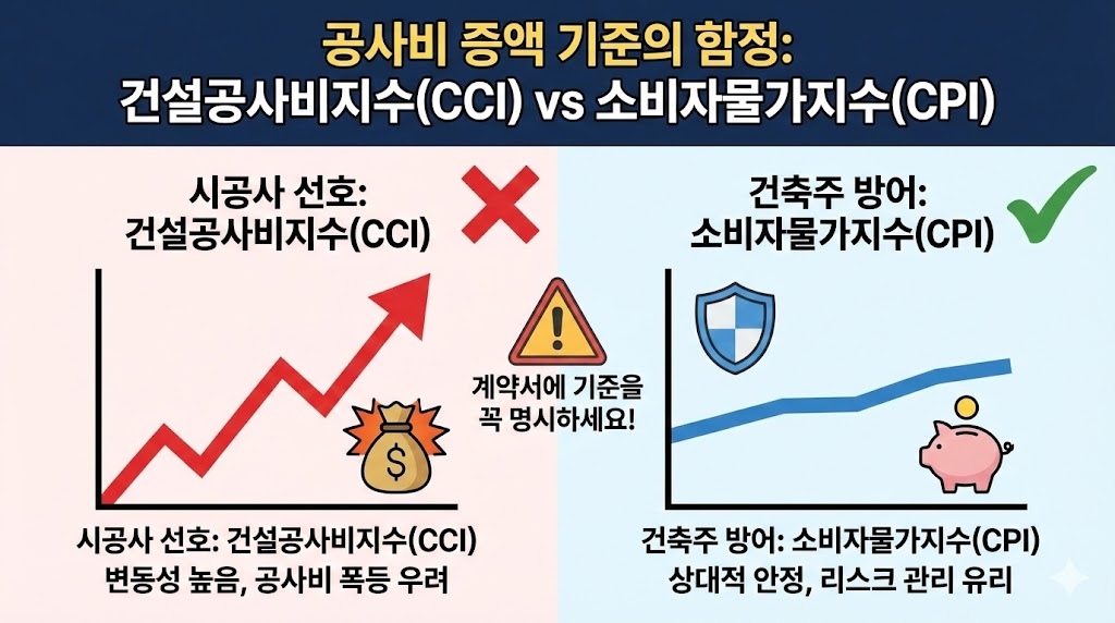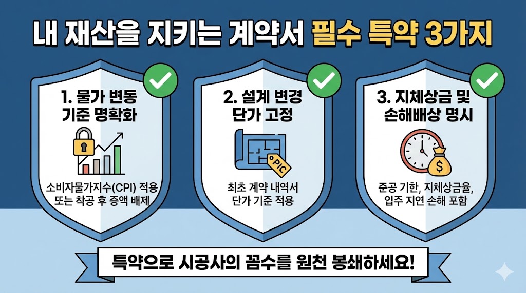 - 방어 특약: '소비자물가지수(CPI)' 적용을 명시하거나, **'착공 후 물가 변동으로 인한 증액 배제'**를 넣어야 합니다.