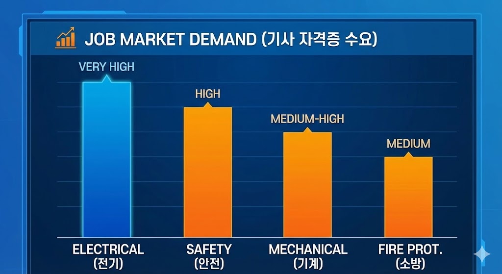 아래 이미지는 본문에서 다룬 4가지 핵심 기사 자격증(전기, 안전, 기계, 소방)의 채용 수요를 직관적인 막대그래프로 시각화했습니다.