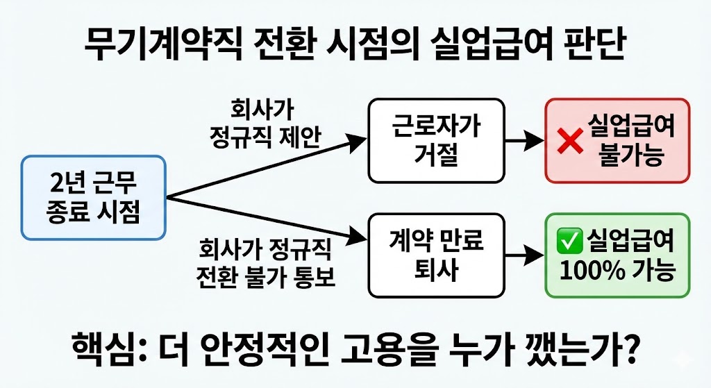- 반대 상황: 2년이 되었는데 회사가 정규직 전환을 안 해주고 "법 때문에 더 고용 못 하니 나가라"고 함. -> 이 경우는 실업급여 100% 가능입니다.