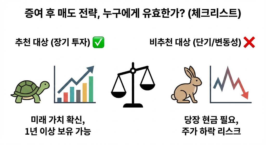 아래 이미지는 이 전략이 누구에게 적합하고 누구에게 위험한지를 명확히 구분해 주는 체크리스트형 인포그래픽입니다. '추천 대상(장기 투자)'은 거북이 아이콘과 우상향 그래프로, '비추천 대상(단기/변동성)'은 토끼 아이콘과 급락 그래프로 표현하여 독자가 자신의 투자 스타일과 상황에 맞춰 전략적인 판단을 내릴 수 있도록 돕습니다.