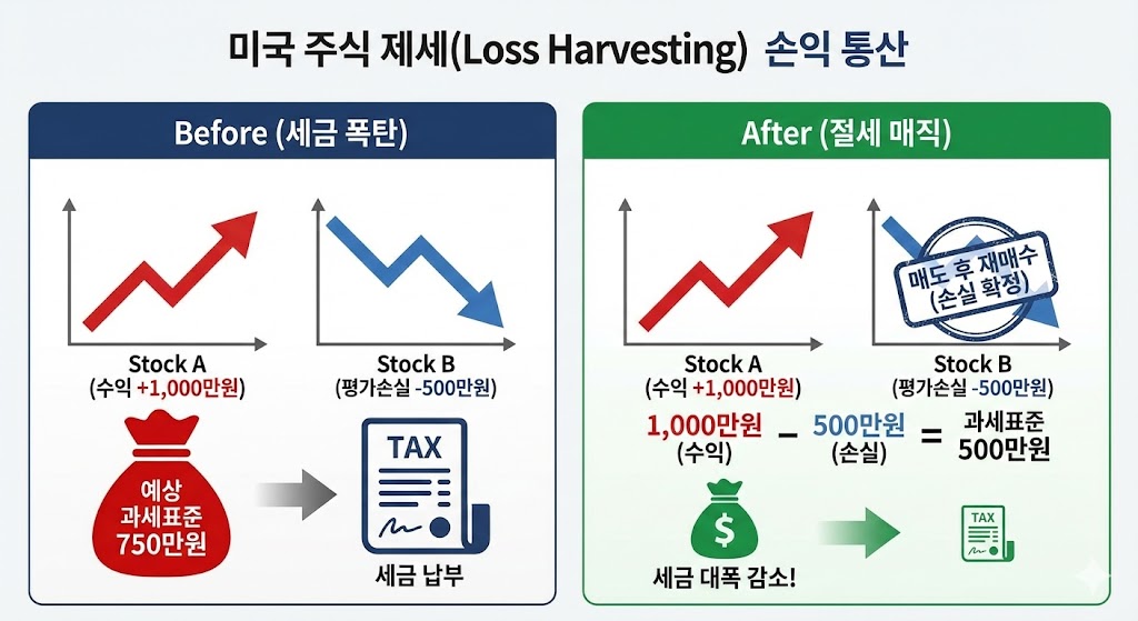 가장 강력하고 확실한 방법입니다. 미국 주식 세금은 1년 동안의 '총수익'과 '총손실'을 합친(통산) 순수익에 대해서만 매겨집니다.