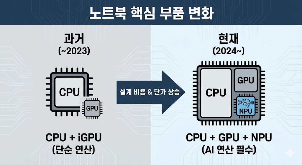 아래 이미지는 과거(~2023)의 CPU 구조(단순 연산)와 현재(2024~)의 CPU 구조(AI 연산을 위한 NPU 추가)를 비교한 인포그래픽입니다. NPU라는 새로운 핵심 부품이 추가되면서 칩 설계 비용과 단가가 상승했음을 화살표와 텍스트로 직관적으로 보여줍니다.