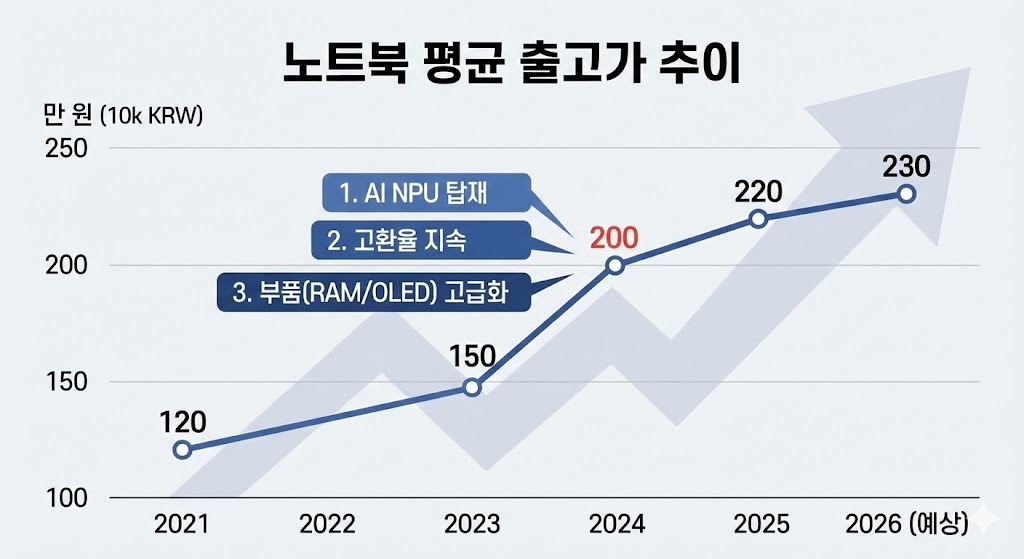 아래 이미지는 2021년부터 2026년(예상)까지의 노트북 평균 출고가 변화를 나타내는 꺾은선 그래프입니다. 2024년을 기점으로 가격이 급등하여 200만 원을 돌파하는 모습을 보여주며, 이 시점에 'AI NPU 탑재', '고환율 지속', '부품 고급화'라는 세 가지 핵심 원인이 복합적으로 작용했음을 말풍선으로 설명하고 있습니다.