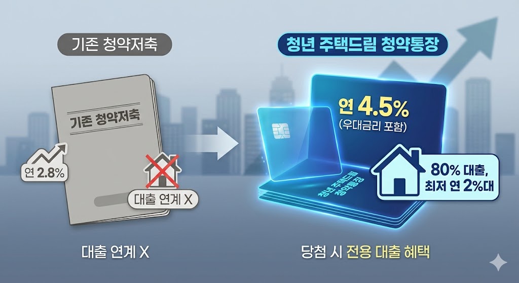 아래 이미지는 기존 청약저축과 2026년형 '청년 주택드림 청약통장'의 혜택을 직관적으로 비교하는 인포그래픽입니다. 왼쪽의 낡은 기존 통장(연 2.8%, 대출 연계 X)과 대비되어, 오른쪽의 빛나는 새 통장은 높은 금리(연 4.5%)와 함께 당첨 시 '분양가 80% 대출, 최저 연 2%대'라는 파격적인 금융 혜택이 있음을 시각적으로 강조합니다.