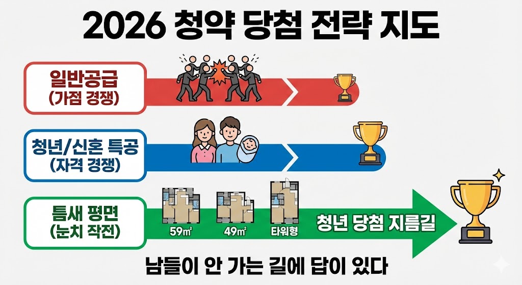 아래 이미지는 2026년 청약 당첨을 위한 세 가지 전략을 비교하는 로드맵 인포그래픽입니다. 치열한 경쟁의 '일반공급(가점 경쟁)'과 자격 요건이 중요한 '청년/신혼 특공(자격 경쟁)'과 달리, 59㎡, 49㎡, 타워형 등 비선호 타입을 노리는 '틈새 평면(눈치 작전)' 전략이 '청년 당첨 지름길'임을 가장 크고 확실한 트로피로 보여줍니다.